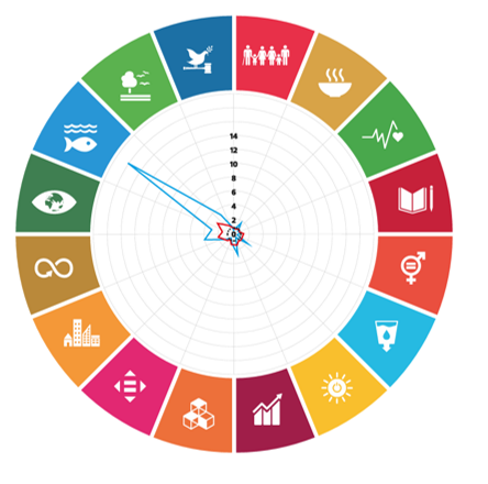 Resultados em Indice de Atividade Relativa SCI VAL – Scopus consultado a 6 de Outubro 2025 – definido como o contributo da produção cientifica da UAlg nos diferentes ODS (linha azul) em relação à produção mundial nesse mesmo ODS (tracejado central) Portugal (linha vermelha).